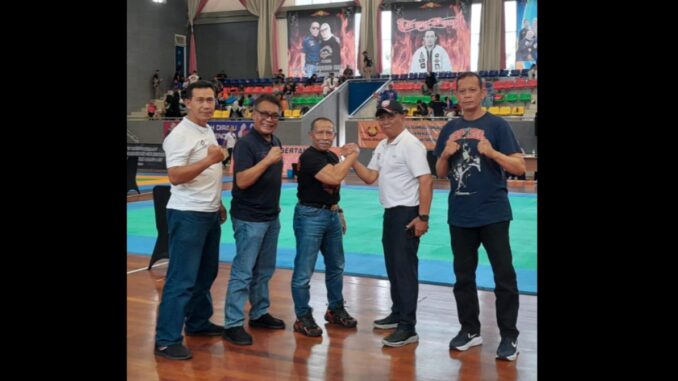 Guru besar Tarung Derajat , AA Boxer bersama Ketua KONI Kota Cimahi, Aris Permono dan jajarannya sebelum pertandingan dimulai di GOR Gymnasium Sekolah Vokasi Institut Pertanian Bogor( IPB) Kota Bogor, Kamis (14/11/2025). Foto : Aris Prabowo